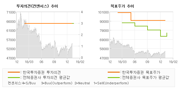 | 의견제시일자 | 증권사 | 투자의견 | 목표가 | | 20190201 | 한국투자증권 | 매수(유지) | 91,000 | | 20190201 | DB금융투자 | BUY(유지) | 65,000 | | 20190108 | 현대차증권 | BUY | 72,000 | | 20181204 | 흥국증권 | BUY(유지) | 80,000 |