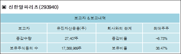 신한알파리츠(293940)는 01일 최대주주 유진자산운용(주)를 비롯한 특별관계자의 보유주식이 감소되었다고 발표했다. 이는 직전 보고일보다 27,407주 증가하여 지분율은 36.47%로 상승했다. 이번 보고 사유는 주주배정유상증자신주취득으로인한변동보고로 알려졌다.