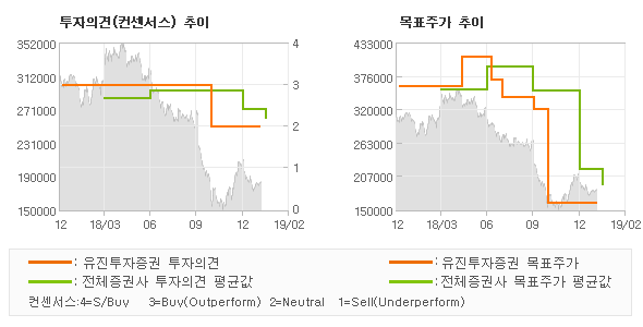 | 의견제시일자 | 증권사 | 투자의견 | 목표가 | | 20190201 | 유진투자증권 | HOLD(유지) | 160,000 | | 20190201 | 삼성증권 | HOLD | 174,000 | | 20190201 | 신한금융투자 | 매수(유지) | 210,000 | | 20190201 | 유안타증권 | HOLD(유지) | 184,000 |