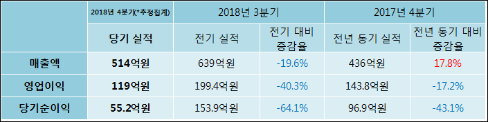 2월 7일 웹젠(069080)의 2018년 4분기 연결 잠정 실적이 발표됐다. 매출액은 작년 같은 기간 대비해서 17.8% 신장된 514억원으로 발표되었다. 매출액 증가에도 불구하고영업이익은 17.2% 감소하여 119억원으로, 당기순이익은 43.1% 줄어들어 55.2억원으로 기록 되었다.