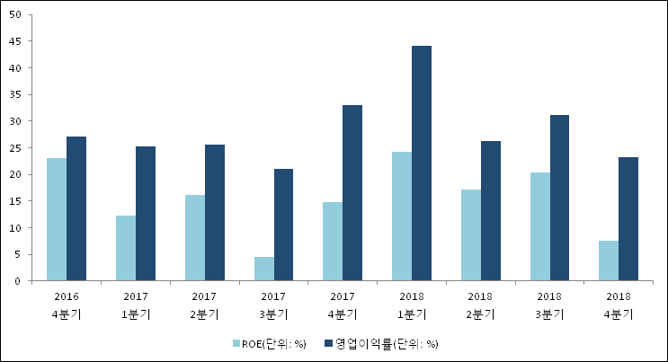 이번분기 기준으로 추정되는 웹젠의 자기자본이익률(ROE)은 7.5%로 나타났다. 전년 동기인 2017년 4분기 ROE는 14.8%로 이번 분기에 7.3%p 하락했다. 한편 동종목의영업이익률은 23.2%이다. 지난해 동기 영업이익률은 33%로 이번 4분기에 9.8%p 하락했다.