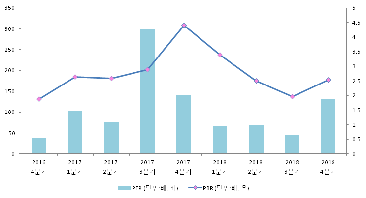 주가가 1주당 수익의 몇배가 되는지 나타내는 주가수익비율(PER)은 130.2배로 나타났다. 전년 동기 PER은 140.47배이다.주가가 1주당 순자산의 몇배인지 알려주는 주가순자산비율인 PBR은 2.53배이다. PBR은 최근 3분기 이상 연속으로 하락하다가 이번 분기에 상승했다. 지난해 동기 PBR은 4.41배로 이번 4분기 PBR이 하락했다.