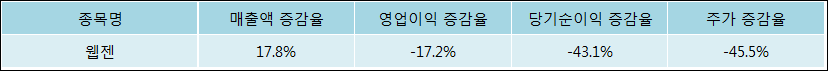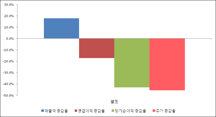 다음은 웹젠과 동일 업종 내 비교 그룹 종목의 각각 최근 실적의 전년 동기 대비 성장률이다. 웹젠의 매출액 증감율은 타 종목 대비 가장 우수한 편이다. 그리고 주가는 하락하였지만 가장 나은 상승률을 기록하였다.