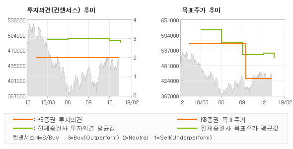 | 의견제시일자 | 증권사 | 투자의견 | 목표가 | | 20190208 | KB증권 | HOLD(유지) | 430,000 | | 20190208 | 키움증권 | BUY(MAINTAIN) | 550,000 | | 20190208 | 하나금융투자 | BUY | 530,000 | | 20190123 | NH투자증권 | BUY(유지) | 500,000 |
