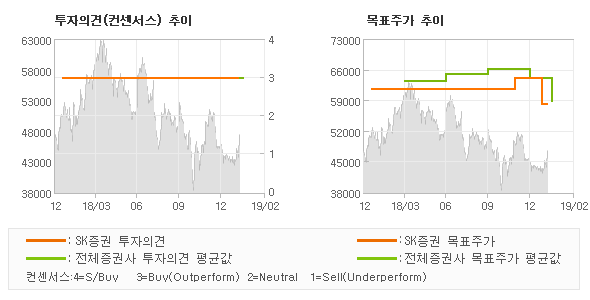 | 의견제시일자 | 증권사 | 투자의견 | 목표가 | | 20190208 | SK증권 | 매수(유지) | 58,000 | | 20190208 | 하나금융투자 | BUY | 60,000 |