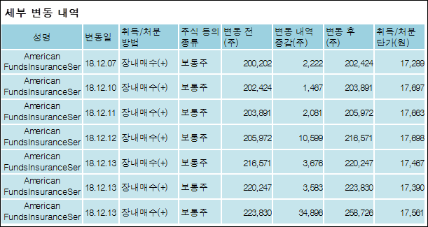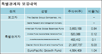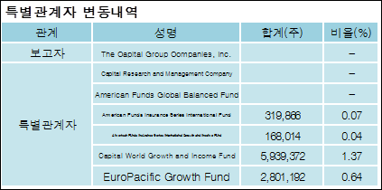 TheCapitalGroupCompanies,Inc.를 비롯한 특별관계자의 보유주식이 증가되었다고 발표했다. 이는 직전 보고일보다 9,228,444주 증가하여 지분율은 7.13%로 상승했다. 이번 보고 사유는 보유비율변동으로 알려졌다.