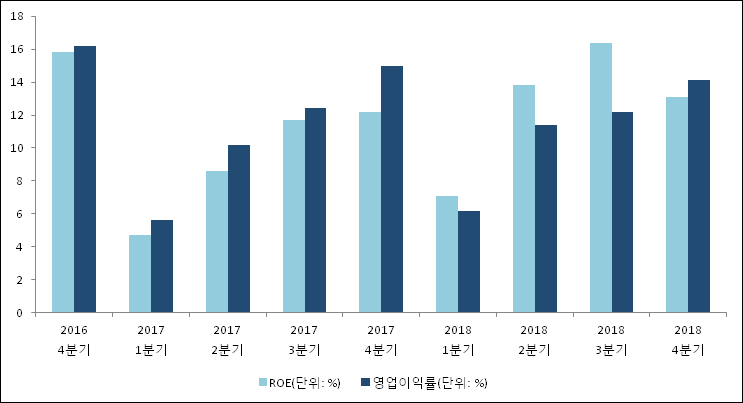 이번분기 기준으로 추정되는 안랩의 자기자본이익률(ROE)은 13.1%로 나타났다. 전년 동기인 2017년 4분기 ROE는 12.2%이다. 한편 동종목의영업이익률은 14.1%이다. 최근 3분기 이상 꾸준히 상승하는 추세이다. 지난해 동기 영업이익률은 15%로 이번 분기와 비슷한 수치이다.