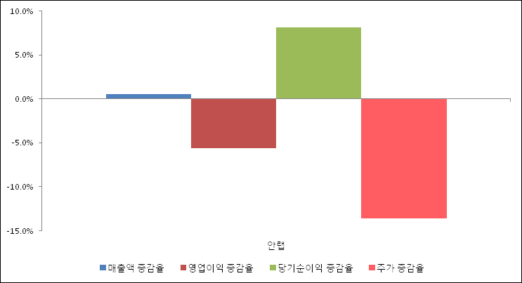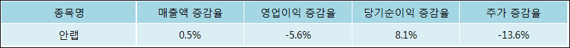 다음은 안랩과 동일 업종 내 비교 그룹 종목의 각각 최근 실적의 전년 동기 대비 성장률이다. 안랩의 매출액 증감율은 타 종목 대비 가장 우수한 편이다. 그리고 주가는 하락하였지만 가장 나은 상승률을 기록하였다.
