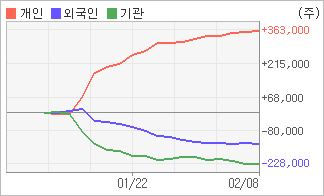 | 외국인과 기관은 순매도, 개인은 순매수(한달누적) 2월1일부터 전일까지 기관이 3거래일 연속 순매도를 보였다. 4주간을 기준으로 보면 외국인이 매도 우위를 지속하면서 135,486주를 순매도했고, 기관도 매도 관점으로 접근하면서 227,251주를 순매도했지만, 개인은 오히려 순매수량을 늘리며 362,737주를 순매수했다. |
