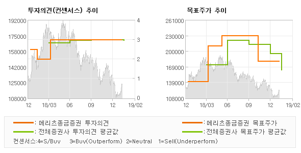 | 의견제시일자 | 증권사 | 투자의견 | 목표가 | | 20190211 | 메리츠종금증권 | BUY | 180,000 | | 20190211 | 현대차증권 | BUY | 145,000 | | 20190211 | SK증권 | 매수(유지) | 160,000 | | 20190211 | 키움증권 | BUY(MAINTAIN) | 215,000 |