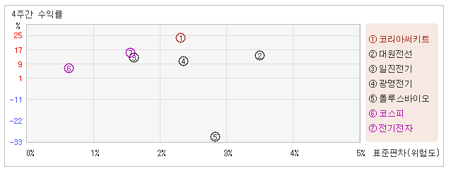 다음으로 업종과 시장을 비교해보면 코리아써키트가 속해 있는 전기전자업종은 코스피지수보다 변동성과 수익률이 모두 높은 모습이다. 다시 말하면 동업종에 탄력이 붙으면서 지수대비 초과상승했다는 의미이다.