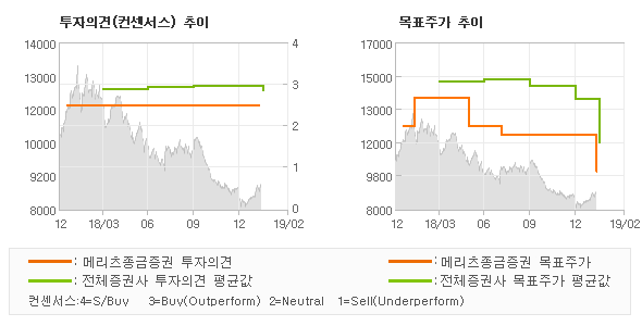 | 의견제시일자 | 증권사 | 투자의견 | 목표가 | | 20190212 | 메리츠종금증권 | TRADING BUY | 10,000 | | 20190212 | 신한금융투자 | 매수(유지) | 11,000 | | 20190212 | 삼성증권 | HOLD | 9,200 | | 20190212 | 현대차증권 | BUY | 15,000 |
