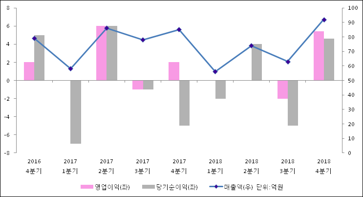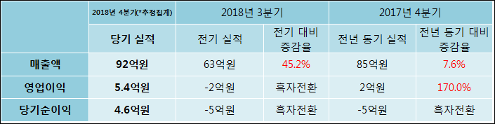 2월 12일 웹스(196700)의 2018년 연간 실적 대량변동 보고서(잠정집계)가 발표됐다. 이를 근거로 4분기 실적을 추정해보면, 매출액은 전년 동기 대비해서 7.6% 증가하여 92억원을 달성했다. 영업이익은 170% 늘어나서 5.4억원을 기록했다. 당기순이익은 -5억원에서4.6억원으로 흑자전환되었다.