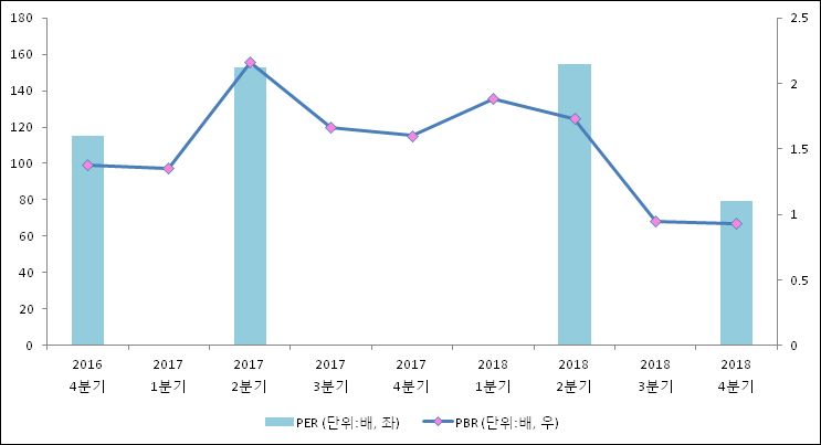 주가가 1주당 수익의 몇배가 되는지 나타내는 주가수익비율(PER)은 79.6배로 나타났다.주가가 1주당 순자산의 몇배인지 알려주는 주가순자산비율인 PBR은 0.93배이다. PBR은 최근 3분기 이상 연속으로 하락하고 있다. 지난해 동기 PBR은 1.6배로 이번 4분기 PBR이 하락했다.