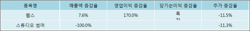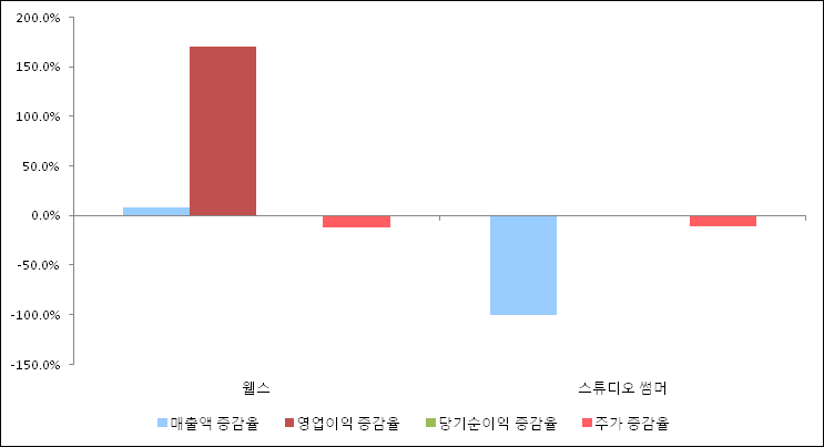 다음은 웹스와 동일 업종 내 비교 그룹 종목의 각각 최근 실적의 전년 동기 대비 성장률이다. 웹스의 매출액 증감율은 타 종목 대비 가장 우수한 편이다. 그리고 주가는 하락하였지만 하락율이 비교적 크지는 않았다.