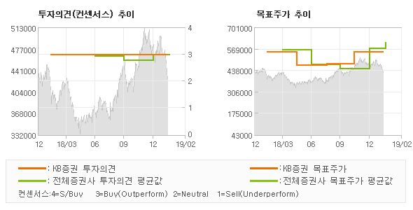 | 의견제시일자 | 증권사 | 투자의견 | 목표가 | | 20190213 | KB증권 | BUY(유지) | 550,000 | | 20190213 | 하나금융투자 | BUY | 600,000 | | 20190213 | 한화투자증권 | BUY(유지) | 600,000 | | 20190129 | 이베스트투자증권 | BUY (MAINTAIN) | 680,000 |
