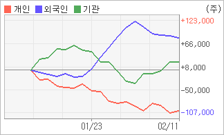 | 외국인/기관 순매수, 개인은 순매도(한달누적) 2월1일부터 전일까지 외국인이 5거래일 연속 동종목을 사들였다. 4주간을 기준으로 보면 외국인이 초반에 동종목을 순매수한 이후에 기세를 이어가며 80,287주를 순매수했고, 기관도 방향성있는 매매를 하면서 21,503주를 순매수했다. 반면 개인들은 매도쪽으로 방향을 잡으면서 101,790주를 순매도한 것으로 나타났다. |