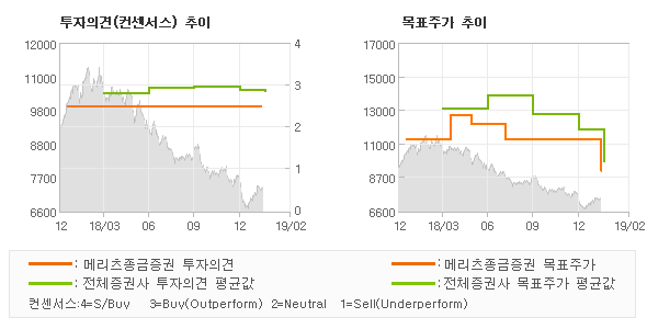 | 의견제시일자 | 증권사 | 투자의견 | 목표가 | | 20190213 | 메리츠종금증권 | TRADING BUY | 9,000 | | 20190213 | 삼성증권 | HOLD | 8,100 | | 20190213 | NH투자증권 | BUY(유지) | 14,000 | | 20190213 | 키움증권 | BUY(MAINTAIN) | 9,000 |