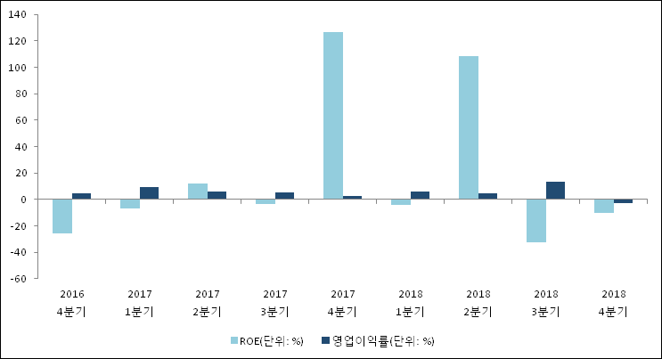 이번분기 기준으로 추정되는 JW홀딩스의 자기자본이익률(ROE)은 -10%로 나타났다. 전년 동기인 2017년 4분기 ROE는 126.3%로 이번 분기에 136.3%p 하락했다. 한편 동종목의영업이익률은 -2.8%이다.최근 일년을 살펴보았을 때 영업이익률이 급락했다. 지난해 동기 영업이익률은 2.8%로 이번 4분기에 5.6%p 하락했다.