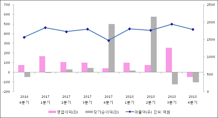 2월 13일 JW홀딩스(096760)의 2018년 연간 실적 대량변동 보고서(잠정집계)가 발표됐다. 이를 근거로 4분기 실적을 추정해보면, 매출액은 지난해 같은 기간 대비해서 21.5% 증가하여 1790억원을 달성했다. 영업이익은 42억원에서 -49.9억원으로 적자전환되었다. 당기순이익은 501억원에서-102.1억원으로 적자전환되었다.