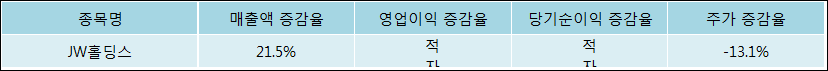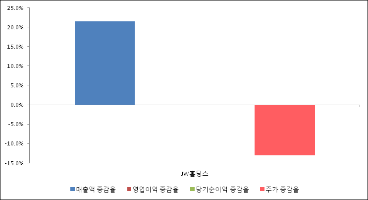 다음은 JW홀딩스와 동일 업종 내 비교 그룹 종목의 각각 최근 실적의 전년 동기 대비 성장률이다. JW홀딩스의 매출액 증감율은 타 종목 대비 가장 우수한 편이다. 그리고 주가는 하락하였지만 가장 나은 상승률을 기록하였다.