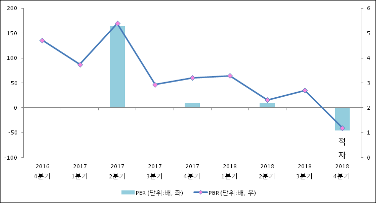주가가 1주당 순자산의 몇배인지 알려주는 주가순자산비율인 PBR은 1.19배이다. 지난해 동기 PBR은 3.21배로 이번 4분기 PBR이 하락했다.