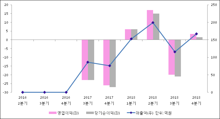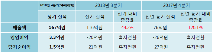 2월 13일 CSA코스믹(083660)의 2018년 연간 실적 대량변동 보고서(잠정집계)가 발표됐다. 이를 근거로 4분기 실적을 추정해보면, 전년 동기 대비해서 매출액은 120.1% 늘어나서 167억원을 기록했다. 영업이익은 3.3억원으로 -26억원에서 흑자전환되었다. 당기순이익은 -27억원에서1.5억원으로 흑자전환되었다.