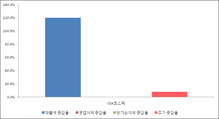 다음은 CSA코스믹과 동일 업종 내 비교 그룹 종목의 각각 최근 실적의 전년 동기 대비 성장률이다. CSA코스믹의 매출액 증감율은 타 종목 대비 가장 우수한 편이다. 그리고 주가는 가장 높은 상승률을 보였다.