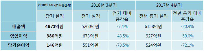2월 13일 넷마블(251270)의 2018년 4분기 연결 잠정 실적이 발표됐다. 매출액, 영업이익, 당기순이익 모두 전년 같은 기간 대비해서 감소하였다. 매출액은 20.9% 감소한 4871억원으로 발표됐다. 영업이익은 59% 줄어들어 380억원을, 당기순이익은 72.1% 하락한 146억원을 기록하였다.