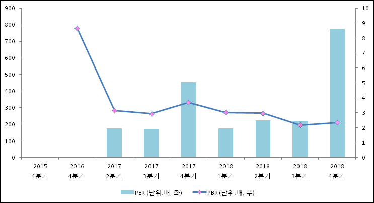 주가가 1주당 수익의 몇배가 되는지 나타내는 주가수익비율(PER)은 772.4배로 나타났다. 전년 동기 PER은 454.22배로 이번 분기에 상승했다.주가가 1주당 순자산의 몇배인지 알려주는 주가순자산비율인 PBR은 2.34배이다. PBR은 최근 3분기 이상 연속으로 하락하다가 이번 분기에 상승했다. 지난해 동기 PBR은 3.7배로 이번 4분기 PBR이 하락했다.