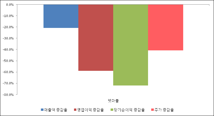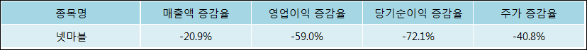 다음은 넷마블과 동일 업종 내 비교 그룹 종목의 각각 최근 실적의 전년 동기 대비 성장률이다. 넷마블의 매출액은 감소했지만 증감율은 타 종목 대비 가장 우수한 편이다. 그리고 주가는 하락하였지만 가장 나은 상승률을 기록하였다.