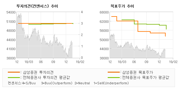 삼성증권의 동종목에 대한 최근 1년동안의 투자의견은 전체적으로 큰 변화없이 유지되고 있다. 목표주가는 2018년1월 65,000원까지 높아졌다가 2018년10월 54,000원을 최저점으로 목표가가 제시된 이후 최근에 52,000원으로 새롭게 조정되고 있다.