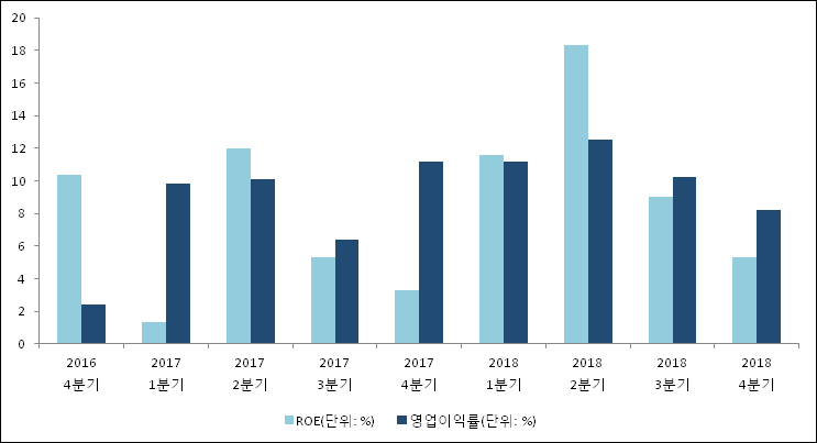 이번분기 기준으로 추정되는 비엠티의 자기자본이익률(ROE)은 5.3%로 나타났다. 전년 동기인 2017년 4분기 ROE는 3.3%로 이번 분기에 2%p 상승했다. 한편 동종목의영업이익률은 8.2%이다. 지난해 동기 영업이익률은 11.2%로 이번 4분기에 3%p 하락했다.