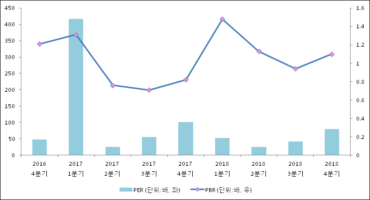 주가가 1주당 수익의 몇배가 되는지 나타내는 주가수익비율(PER)은 80.7배로 나타났다. 전년 동기 PER은 101배로 이번 분기에 하락했다.주가가 1주당 순자산의 몇배인지 알려주는 주가순자산비율인 PBR은 1.1배이다. 지난해 동기 PBR은 0.82배로 이번 4분기 PBR이 상승했다.