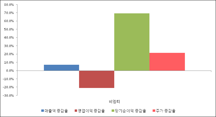 다음은 비엠티와 동일 업종 내 비교 그룹 종목의 각각 최근 실적의 전년 동기 대비 성장률이다. 비엠티의 매출액 증감율은 타 종목 대비 가장 우수한 편이다. 그리고 주가는 가장 높은 상승률을 보였다.