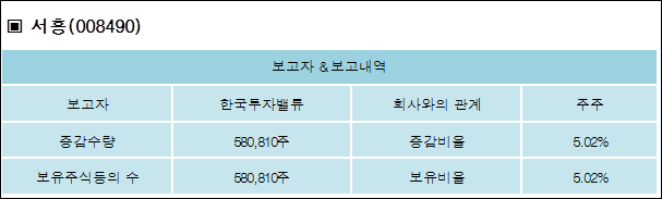 서흥(008490)은 14일 주주 한국투자밸류의 보유주식이 증가되었다고 발표했다. 이는 직전 보고일보다 580,810주 증가하여 지분율은 5.02%로 상승했다. 이번 보고 사유는 단순투자목적의5%보유주식의신규보고로 알려졌다.