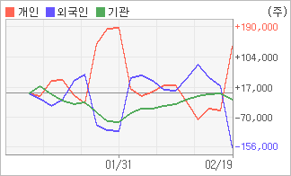 | 외국인과 기관은 순매도, 개인은 순매수(한달누적) 2월15일부터 전일까지 외국인이 3거래일 연속 순매도했다. 4주간을 기준으로 보면 외국인이 순매도로 돌아서면서 155,854주를 순매도했고, 기관도 매도 우위를 보이면서 18,659주를 순매도했지만, 개인은 오히려 순매수량을 늘리며 134,373주를 순매수했다. |