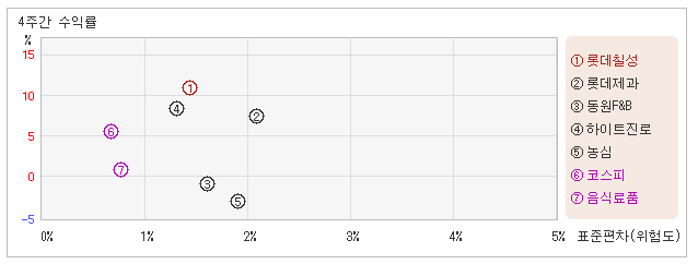 다음으로 업종과 시장을 비교해보면 롯데칠성이 속해 있는 음식료품업종은 코스피지수보다 변동성은 높고, 수익률은 낮은 모습을 보여주고 있다. 다시 말해서 동업종은 지수보다 크게 오르락 내리락 했지만, 상승률은 오히려 지수보다 못하다는 의미이다.