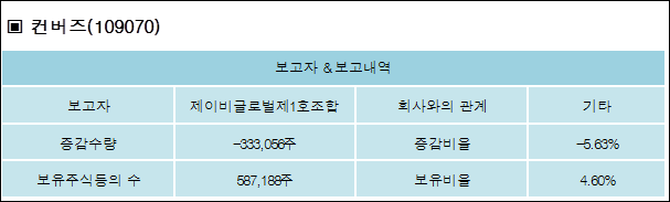 컨버즈(109070)는 20일 기타 제이비글로벌제1호조합의 보유주식이 증가되었다고 발표했다. 이는 직전 보고일보다 333,056주 감소하여 지분율은 4.6%로 하락했다. 이번 보고 사유는 조합원탈퇴로인한조합지분변동으로 알려졌다.