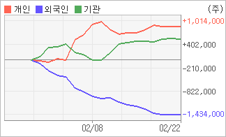 | 기관/개인 순매수, 외국인은 순매도(한달누적) 전일 외국인이 4,382주를 사들인 반면 기관은 7,485주를 팔았다. 4주간을 기준으로 보면 기관이 순매도를 기록하다가 다시 순매수로 돌아서면서 554,350주를 순매수했고, 개인들도 매기를 떨어뜨리면서도 875,057주를 순매수했다. 반면 그 동안 외국인은 매도 우위를 지속하면서 1,429,407주를 순매도했다. |