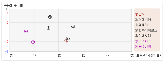 | 만도 | 한화에어로스페이스 | 현대로템 | 쌍용차 | 현대위아 | |
