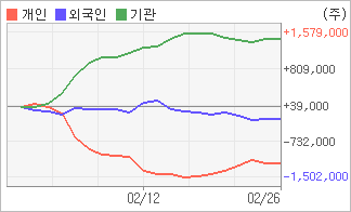 | 외국인과 개인은 순매도, 기관은 순매수(한달누적) 2월22일부터 전일까지 외국인이 2거래일 연속 순매수를 보였다. 4주간을 기준으로 보면 기관이 방향성있는 매매를 하면서 1,450,887주를 순매수한 반면, 외국인은 순매도로 돌아서면서 256,645주를 순매도했고, 개인들도 초반에 동종목을 순매도한 이후에 근래에는 순매도량을 줄이면서 1,194,984주를 순매도했다. |