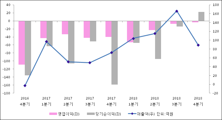 2월 26일 메타랩스(090370)의 2018년 연간 실적 대량변동 보고서(잠정집계)가 발표됐다. 이를 근거로 4분기 실적을 추정해보면, 작년 같은 기간 대비해서 매출액은 23.1% 늘어나서 89억원을 기록했다. 영업이익은 -40억원에서 -3.8억원으로 적자폭이 축소되었다고 발표했다. 당기순이익은 22억원으로 -159억원에서 흑자전환되었다.
