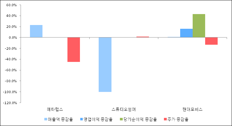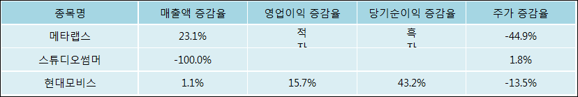 다음은 메타랩스와 동일 업종 내 비교 그룹 종목의 각각 최근 실적의 전년 동기 대비 성장률이다. 메타랩스의 매출액 증감율은 타 종목 대비 가장 우수한 편이다. 그리고 주가의 하락율이 비교적 큰 편으로 나타났다.