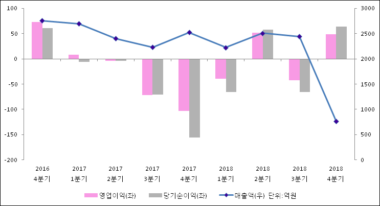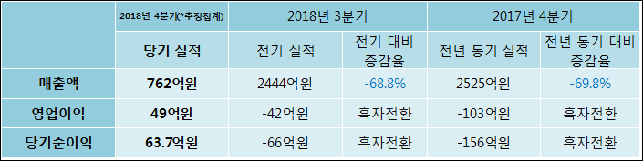 2월 27일 한국프랜지공업(010100)의 2018년 연간 실적 대량변동 보고서(잠정집계)가 발표됐다. 이를 근거로 4분기 실적을 추정해보면, 매출액은 작년 같은 기간 대비해서 69.8% 감소하여 762억원라고 발표됐다. 영업이익은 -103억원에서 49억원으로 흑자전환되었다. 당기순이익은 -156억원에서63.7억원으로 흑자전환되었다.