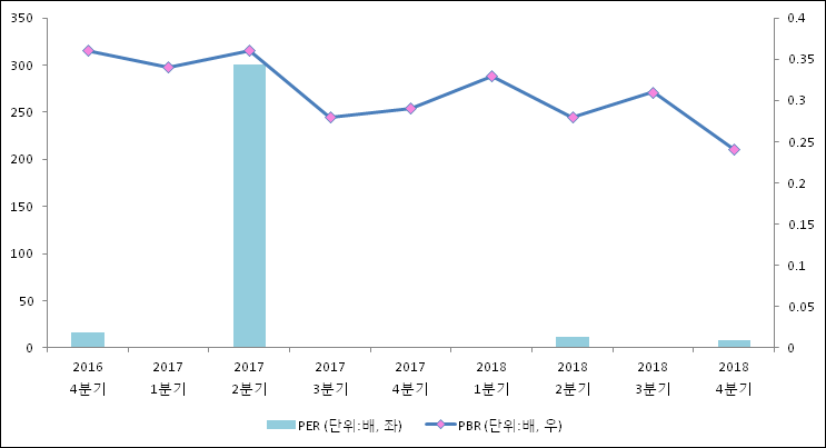주가가 1주당 수익의 몇배가 되는지 나타내는 주가수익비율(PER)은 8.2배로 나타났다.주가가 1주당 순자산의 몇배인지 알려주는 주가순자산비율인 PBR은 0.24배이다. 지난해 동기 PBR은 0.29배로 이번 4분기 PBR이 하락했다.