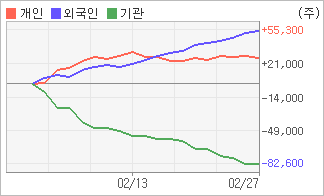 | 외국인/개인 순매수, 기관은 순매도(한달누적) 2월13일부터 외국인들이 11거래일 연속 순매수 행진을 벌이고 있다. 4주간을 기준으로 보면 외국인이 초반에 동종목을 순매수한 이후에 기세를 이어가며 55,203주를 순매수했고, 개인들도 매기를 떨어뜨리면서도 27,057주를 순매수했다. 하지만 기관은 매도 관점으로 접근하면서 82,260주를 순매도했다. |