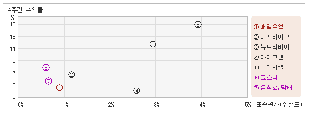 | 업종지수와 비교해서 위험대비 수익률 좋다고 할 수 없어 28일 오후 12시10분 현재 전일대비 2.42% 오른 80,400원을 기록하고 있는 매일유업은 지난 1개월간 1.9% 상승했다. 동기간 동안에 주가움직임의 위험지표인 표준편차는 0.9%를 기록했다. 이는 음식료,담배 업종내에서 주요종목들과 비교해볼 때 매일유업의 월간 변동성이 가장 작았던 만큼 주가상승률도 주요종목군 내에서 상대적으로 낮았다는 것을 의미한다. 최근 1개월을 기준으로 매일유업의 위험을 고려한 수익률은 2.1을 기록했는데, 변동성은 가장 낮았으나 주가상승률 또한 높지 않았기 때문에 위험대비 수익률은 저조한 모습을 보여줬다. 게다가 음식료,담배업종의 위험대비수익률인 5.3보다도 낮기 때문에 업종대비 성과도 긍정적이라고 할 수 없다. 다음으로 업종과 시장을 비교해보면 매일유업이 속해 있는 음식료,담배업종은 코스닥지수보다 변동성은 높고, 수익률은 낮은 모습을 보여주고 있다. 다시 말해서 동업종은 지수보다 크게 오르락 내리락 했지만, 상승률은 오히려 지수보다 못하다는 의미이다. |