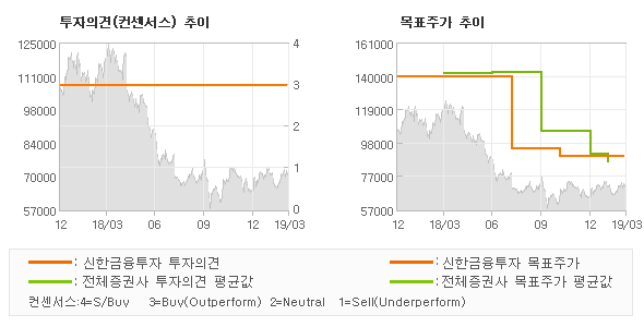 | 의견제시일자 | 증권사 | 투자의견 | 목표가 | | 20190305 | 신한금융투자 | 매수(유지) | 90,000 | | 20190207 | 한국투자증권 | 매수(유지) | 88,000 | | 20190207 | DB금융투자 | BUY(유지) | 90,000 | | 20190207 | 삼성증권 | BUY | 80,000 |