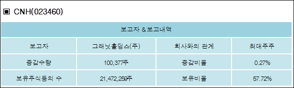 CNH(023460)는 05일 최대주주 그래닛홀딩스(주)를 비롯한 특별관계자의 보유주식이 증가되었다고 발표했다. 이는 직전 보고일보다 100,377주 증가하여 지분율은 57.72%로 상승했다. 이번 보고 사유는 주식매수및주요계약체결에 따른 변경으로 알려졌다.